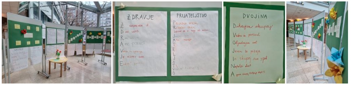 Various literary and artistic pieces are created by our students throughout the school year, but we decided to also put them on display for the visitors of the University Children’s Hospital Ljubljana. For World Poetry Day we prepared an exhibition of poetry in the lobby of our paediatrics clinic and invited children, parents, medical staff, and other passers-by at the clinic to co-create the poetic lines with us in the exhibition.